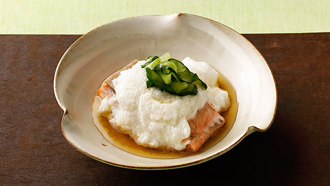 - かぶら蒸しとは、具材にすりおろしたカブをかけて蒸した後、葛あんや澄まし汁をかけていただく料理です。今回はサーモンをさっぱりいただくため、だし入り三杯酢を使っています。