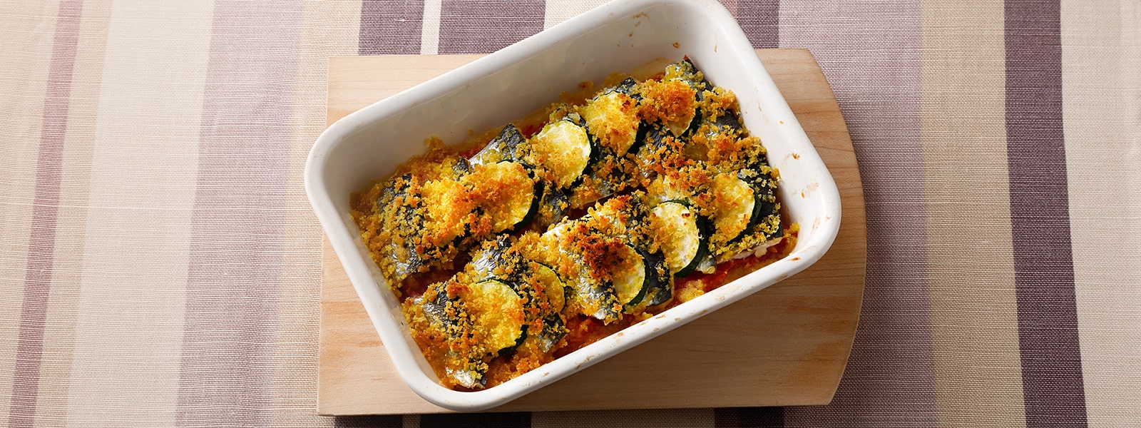 レンジグリルで焼く- 耐熱容器にトマトを敷いて塩をふり、その上にイワシとズッキーニを交互に並べてオリーブ油をまわしかけ、スパイスパン粉を全体にふる。