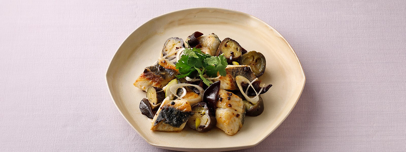 キクラゲ、長ネギ、ナス、スズキを順に加えてその都度軽く和える。