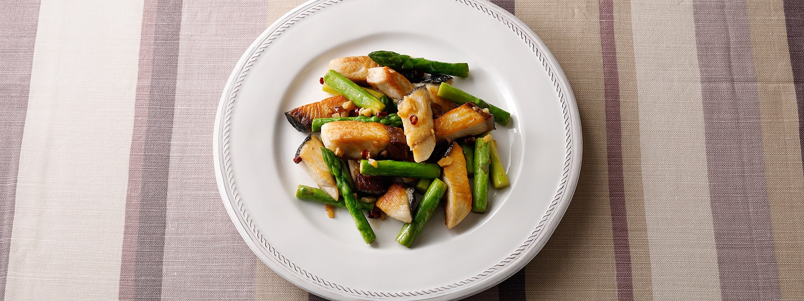 ブリの身としゃきっと歯ごたえのあるアスパラがよく合います。