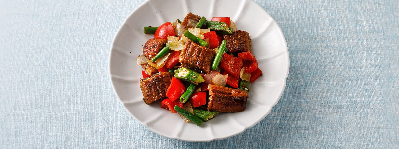 ウナギの蒲焼とオクラ、パプリカ、インゲンなどの夏野菜を一緒に炒める目先の変わった一品です。