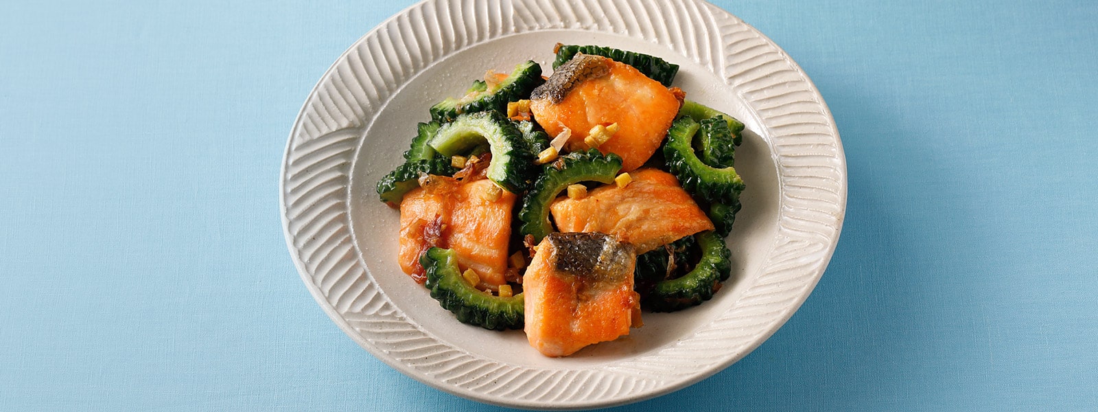 ほろ苦いゴーヤとサーモンを甘辛いみそで炒めた、ごはんが欲しくなる一皿です。