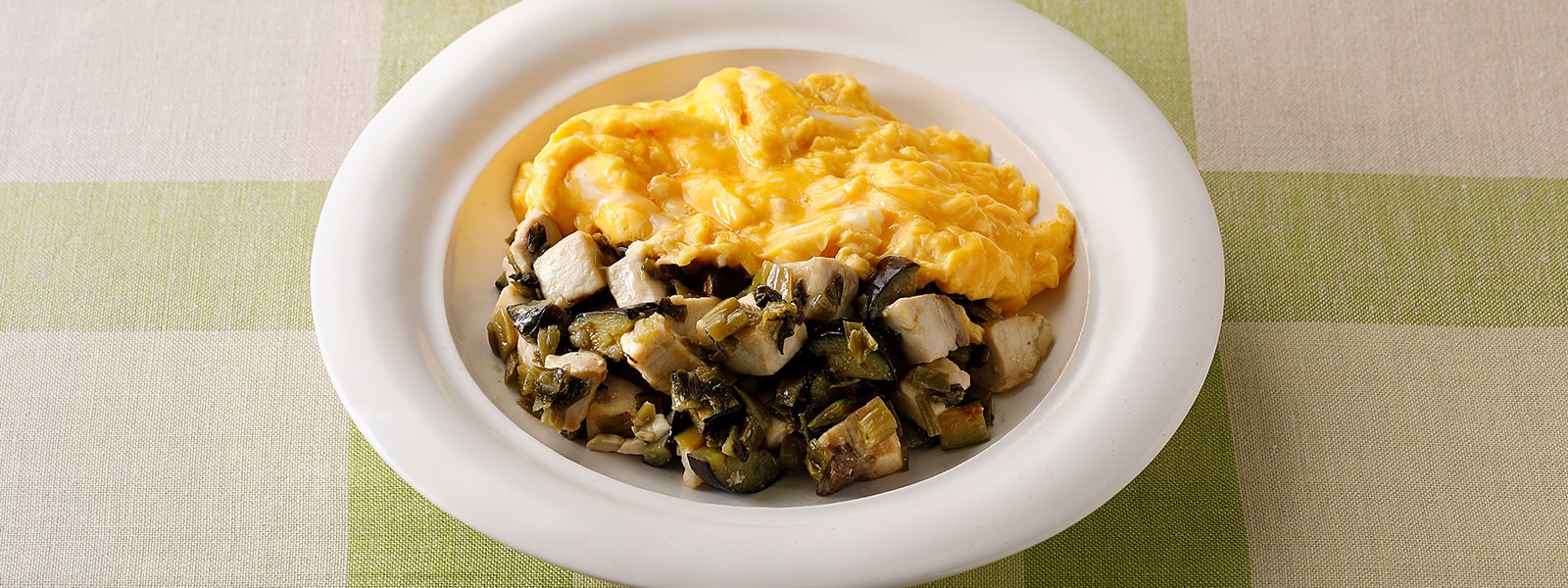 盛る- 器にカジキの高菜炒めと半熟卵を合わせて盛る。