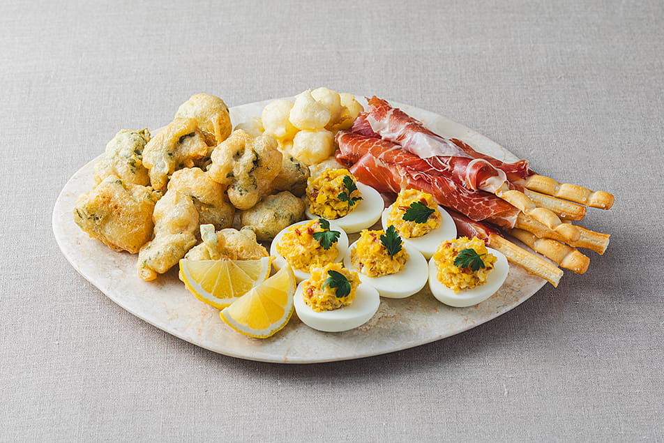 一口サイズの熱々のフリット。ドライトマトとクリームチーズ入りのゆで卵、つまんで食べられる生ハムグリッシーニ。前菜盛り合わせは乾杯のお供にもぴったりです。
