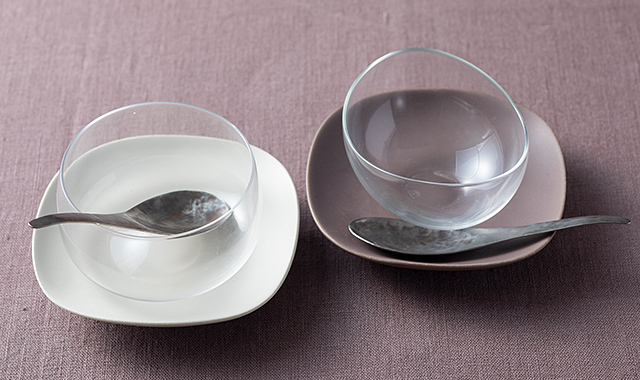 メインを角皿にのせて中央に置き、同じ形の皿をもう一枚並べると、統一感が出ます。口径のある黒い椀は、具が多い吸物にぴったり。具の色が映えますし、食卓に黒い器が入ると全体が締まります。ソースを入れたガラスの器に受け皿をつけると、手渡しする際に安定感が出て、おもてなしの食卓に似合います。