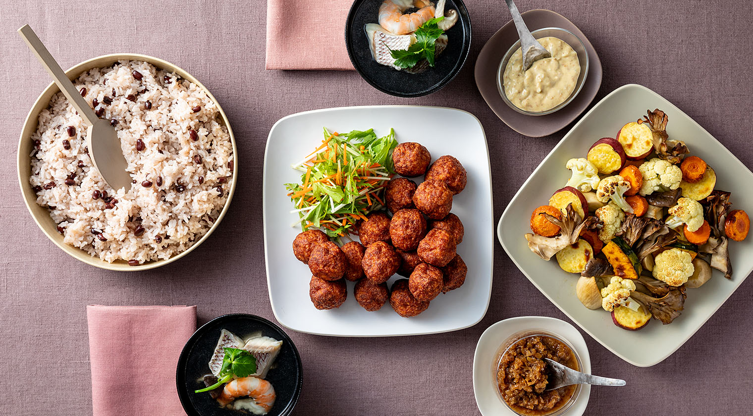 もう一品は、気軽に作れて華やかさのある焼き野菜をどうぞ。あれば赤飯も添えて。