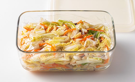 漬けるボウルに白菜とニンジンを合わせて入れ、塩をふって全体を混ぜ合わせる。水を入れたボウルなど重石をのせて30分ほど漬け、一度上下を返すように軽く混ぜ、再び重石をして30分ほど漬ける。しんなりとしたら、しっかり水気を絞る。