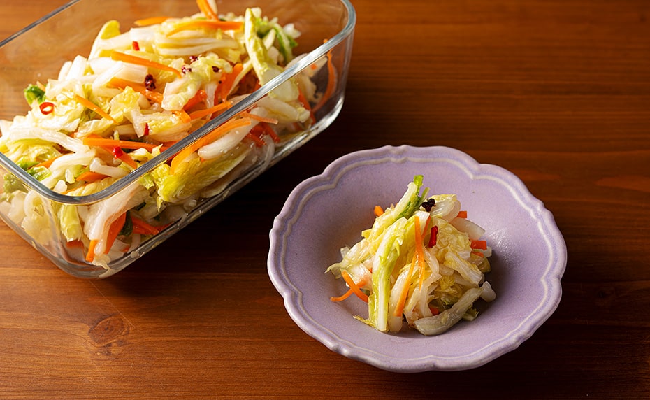 ・ラーパーツァイは白菜の中華風甘酢漬けです。中華風麹で調味することで、甘酢に香味野菜の風味が合わさり、味わい深くなります。