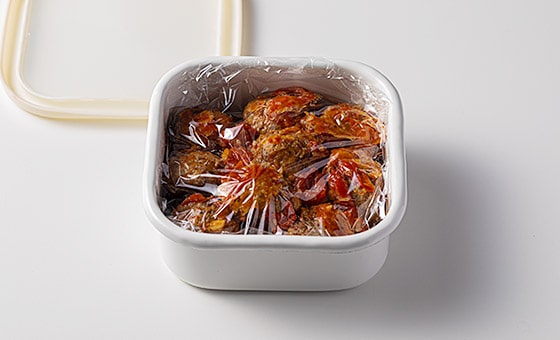 煮る③のフライパンの脂をペーパータオルでふき、残りのオリーブ油、ニンニクを入れて【火力3~4】で炒める。香りがしてきたらプチトマトを加えて軽く炒め、合わせ調味料を加える。ミートボールを戻し入れ、蓋をして【火力2~3】で7~8分煮る。蓋を外し、【火力3~4】で煮汁が少なくなるまで煮詰める。火を止めて冷ます。