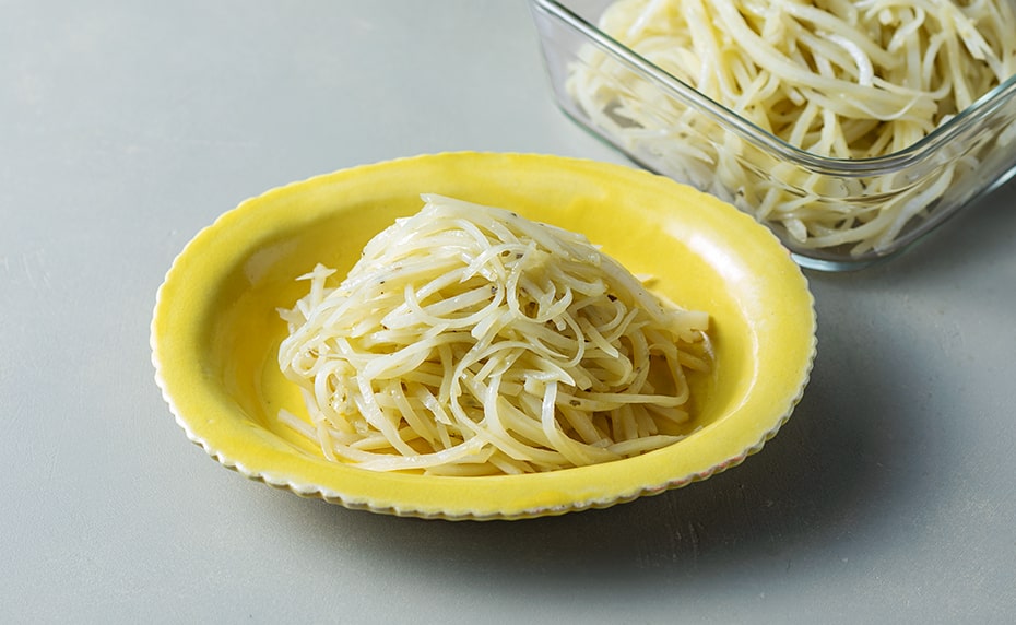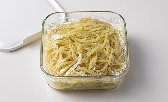 下ごしらえをするジャガイモはスライサーでせん切りにする。たっぷりの水に入れ、何度か水を変えながら1~2時間水にさらしてデンプンを流し、ザルにあげて水気をしっかりとおさえる。