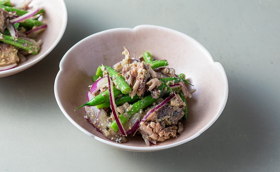 和えるボウルに調味料を入れて泡立て器で混ぜ合わせ、サバの身を加え混ぜる。インゲン、紫タマネギを加えて和える。