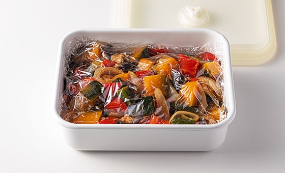 ・保存する際の「落としラップ」とは、料理に密着させるようにラップをかけ、できるだけ空気に触れさせないようにすることです。保存容器の蓋に水滴がついた場合でも、落としラップがあれば料理に水滴が落ちず、保存性が高まるので、ぜひ落としラップをしましょう。料理を取り分けた際には、ラップは交換しましょう。
