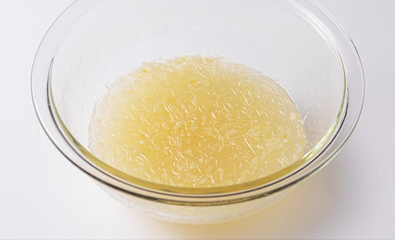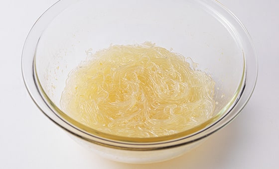 春雨をレンジで戻す耐熱ボウルに春雨を入れ、レモン甘酢をまわしかける。ふわりとラップをして【レンジ】【手動600W】で5分加熱し、とり出す。ラップを外して軽く混ぜ合わせ、10分ほど置く。