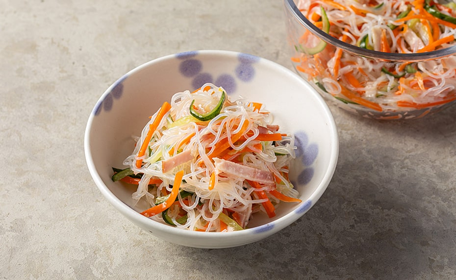 和える春雨のボウルにキュウリ、ニンジン、ロースハムを加えて和える。