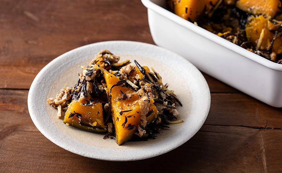 ・ショウガの爽やかな風味、油揚げのコク、ヒジキの磯の香り、塩麹とかつお節のうま味が合わさり、ごはんにぴったりのカボチャの煮ものです。