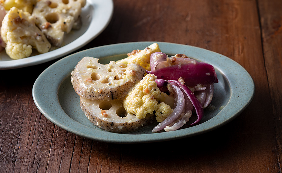 和えるボウルにアンチョビとソース調味料を入れ、泡立て器で混ぜ合わせた後、レンコン、カリフラワー、紫タマネギを加えて和える。