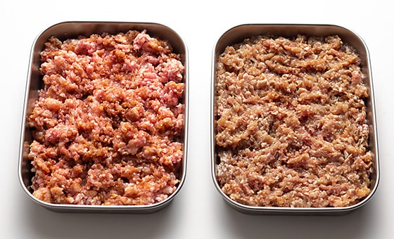 ・ひき肉に麹調味料を混ぜて半日~1日置くと、麹に含まれる酵素により柔らかくジューシーな食感になり、うま味も増します。また、粘りが出てきてパン粉や卵などのつなぎが要らず、肉ダネが作れます。