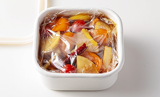 漬ける(保存する)清潔な保存容器に大根、セロリ、パプリカを入れ、ピクルス液を注ぎ入れて粗熱をとる。プチトマトを加え、完全に冷めるまで置く。