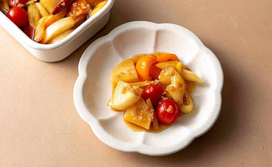 ・しょうゆ麹、昆布、かつお節のうま味により、まろやかな酸味のピクルスとなります。