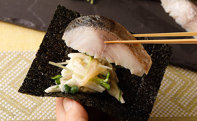 - しめさばはそのままいただいても美味しいですが、少し皮目を焼くだけで、香ばしさとほどよく溶けた脂の美味しさも感じられます。