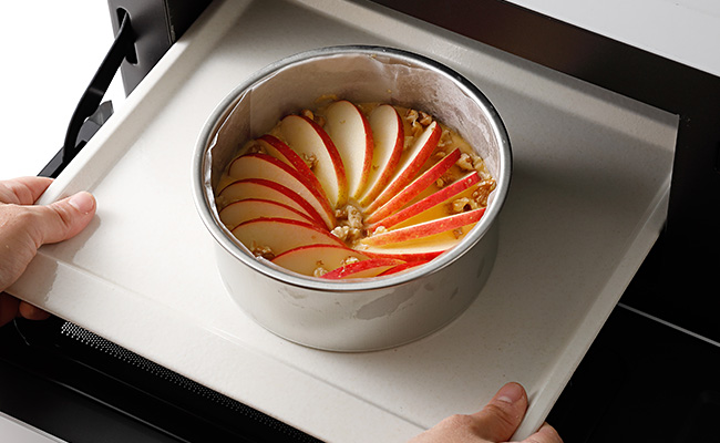 焼く- 型にケーキ生地を入れて薄切りにしたリンゴを並べ、隙間にクルミをのせる。角皿に型をのせ、予熱した【オーブン】【170℃】で40分ほど焼く。中心を竹串で刺して生地がついてこなければ焼き上がり。