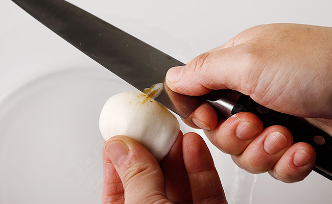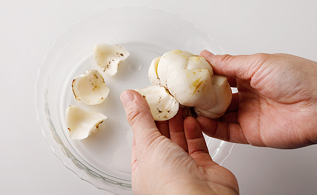 下ごしらえをする- ゆり根は1枚ずつはがして洗い、よごれた部分は包丁でそぎとり、大きいものは半分に切る。熱湯で1~2分ゆでて冷水にとり、ザルにあげて水気を切る。