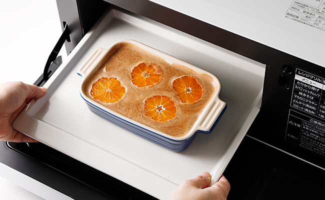 焼く- 耐熱皿にバターを薄く塗り、ミカンの2/3量を並べ入れる。アパレイユを流し入れ、残りのミカンをのせる。