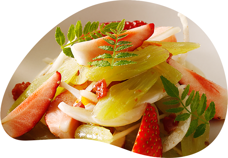フキとイチゴ、この季節ならではの驚きの取り合わせのサラダです。フキのほろ苦さとイチゴの酸味を、セミドライトマトの旨みとホワイトバルサミコ酢の優しい甘みで上手にまとめ上げました。春の香りと風味を存分に味わって。