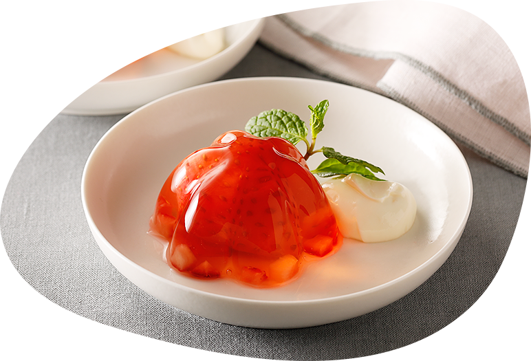 イチゴの爽やかな風味をそのままゼリーにとじ込めた、見た目もかわいいおやつ。フルフルのゼリーに軽く煮たイチゴ、フレッシュな角切りイチゴの3つの食感と美味しさが楽しめます。マスカルポーネクリームの練乳の甘みがイチゴゼリーの爽やかさを引き立てます。パーティーのデザートにもぴったり!