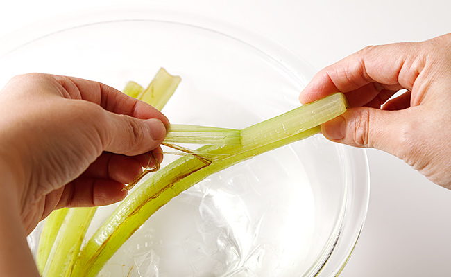 水気をおさえて5~7mm幅の斜め切りにする。