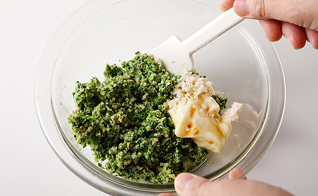 菜の花ソースを作る- フードプロセッサーに菜の花、ニンニク、クルミを入れ、細かくなるまでまわしたらボウルに移し、菜の花ソース調味料をすべて加え、よく混ぜ合わせる。