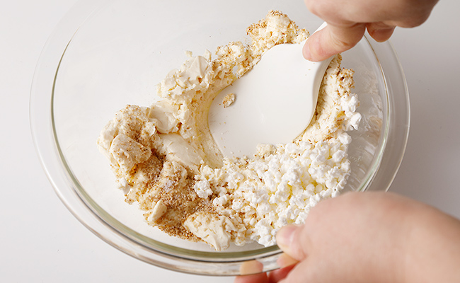 和える- ボウルに水切り豆腐、和え衣材料すべてを入れ、豆腐はゴムベラでボウルに押し当てるようにして潰し、全体をよく混ぜ合わせる。