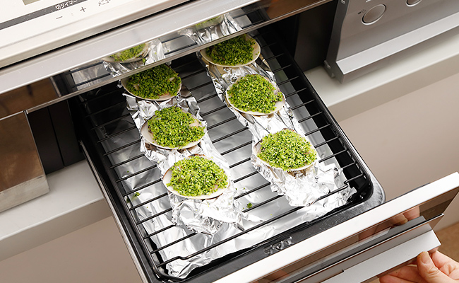 はまぐりが傾かないよう、グリル網にふわりと丸めたアルミホイルを置き、その上にはまぐりをのせて固定させ、【オーブン】【220℃】で薄く色づくまで3~4分焼く。
