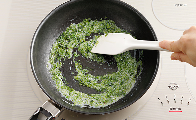 生青のりソースを作る- フライパンにバターを入れて【火力3】で加熱し、バターが溶けたら牛乳、生青のりを順に加えて軽く煮る。