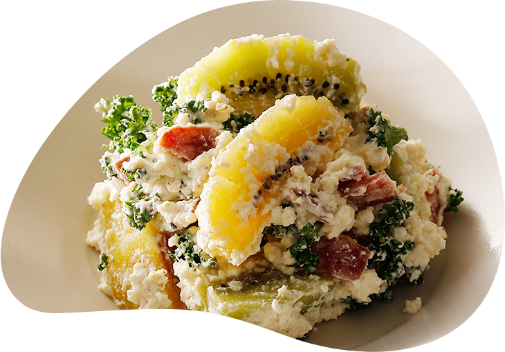 キウイに和のテイストをまとわせました。和え衣は絹ごし豆腐とカッテージチーズを合わせて軽やかな仕上がりに。キウイの爽やかな風味とサラミの塩味が絶妙にマッチした白和えです。日本酒(ぬる燗)またはスパークリングワインがおススメです。