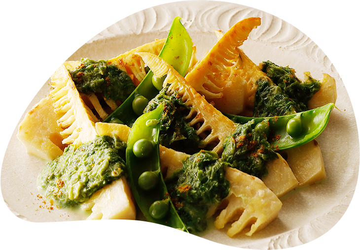 香ばしく焼いたタケノコに磯の香りの青のりソースを添えた、山の幸と海の幸を同時に味わえる一皿です。スナップエンドウの甘さと、パリッとした食感が美味しさのアクセントに。ほんのり香るカレーの風味が、まろやかな青のりソースをさらに引き立たせます。