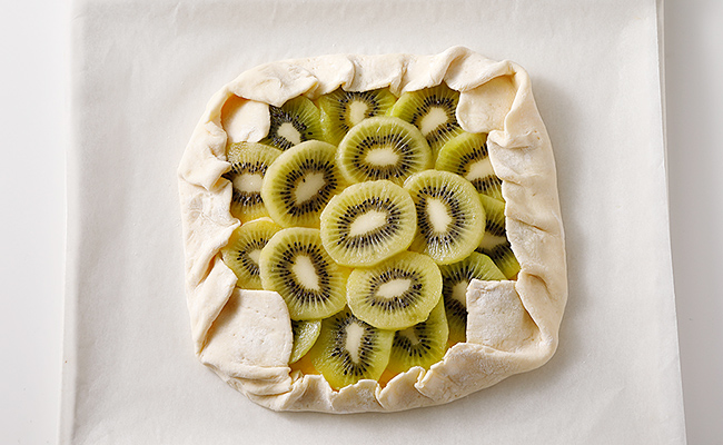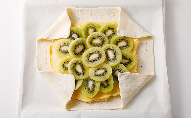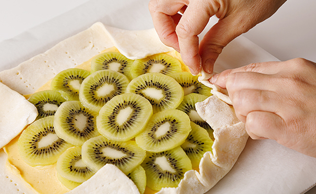 - キウイは固めのものがおススメ。薄く切りやすいことと、カスタードとパイのコクや甘みにさっぱりとしたキウイの酸味がよく合い、バランスのよい味わいに仕上がります。