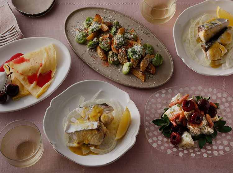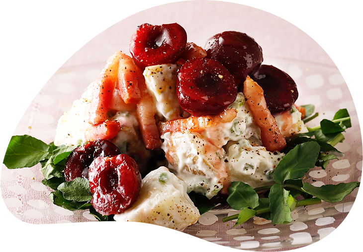 アメリカンチェリーのソテーを、新ジャガイモのポテサラに重ねたオシャレな一皿。ベーコンの旨味と塩味で、チェリーソテーの甘味がより引き立ちます。ポテトはサワークリームと塩麹を合わせて旨味のある味わいに。クレソンのほろ苦さをアクセントに様々な味わいが調和した、ワインに合うポテトサラダです。