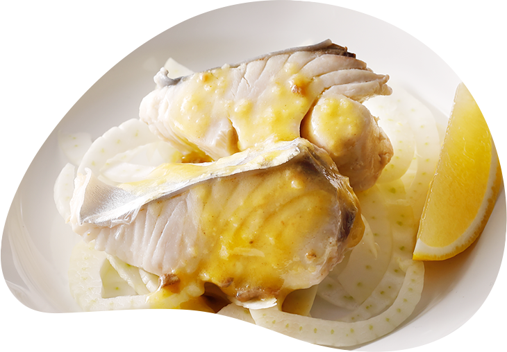 フェンネルは、ほのかな苦みと甘くスッキリとした風味を持つハーブです。爽やかな香りのフェンネルの葉とさわらを「湯煮」にして、身をふっくらと仕上げました。みずみずしいフェンネルの鱗茎は歯ざわりを生かしたスライスに。マスタードドレッシングが、淡白なさわらとフェンネルの美味しさを引き立てます。