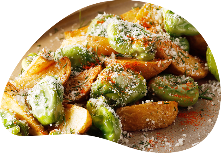 皮ごと素揚げした新ジャガイモとソラ豆に、フェンネルとパルミジャーノ・レッジャーノを混ぜ合わせた“フェンネルチーズ”をかけて仕上げました。爽やかなフェンネルの香りと濃厚なパルミジャーノの旨味が、香ばしくホクホクと揚がった新ジャガイモとソラ豆によく合います。カイエンペッパーをサッとふってアクセントに。アツアツのうちに召し上がれ!