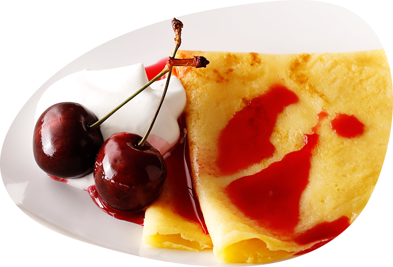 鮮やかな赤色のアメリカンチェリーコンポートは、レンジ加熱で手軽に作れます。サクランボのお酒「キルシュ」が香るコンポートとホイップクリームの組み合せがクレープとの相性抜群です。