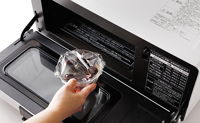 - チェリーは果肉が柔らかく小粒なので、レンジ加熱で手軽に短時間でコンポートが作れます。少量でも作りやすい点もよいところです。小粒イチゴやブドウでも加熱時間を加減すれば同様に作れます。