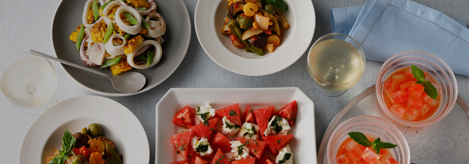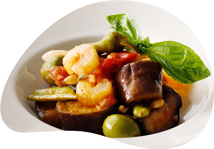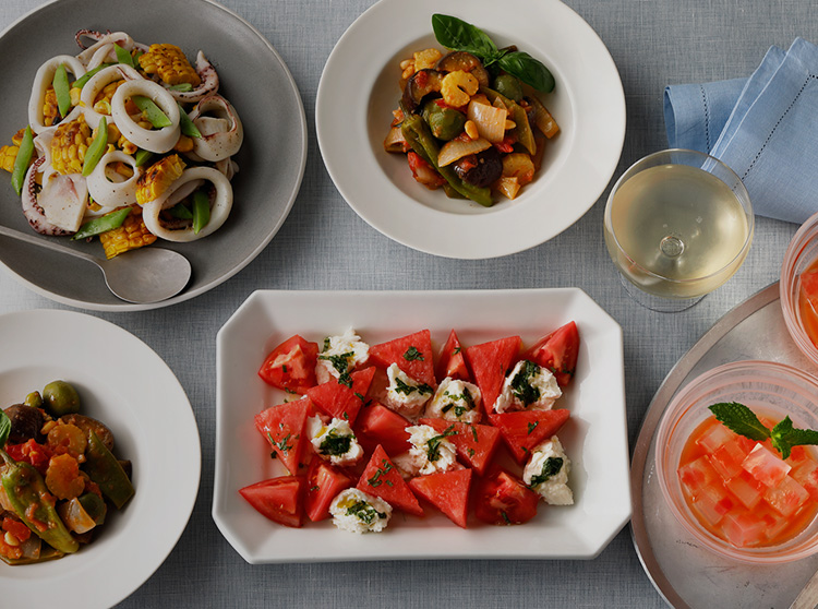 カポナータは野菜の煮込みにビネガーで酸味を加えたイタリア料理のこと。夏野菜の旨味があふれるカポナータは、短時間で蒸し煮して、フレッシュな野菜の美味しさを味わえるように仕上げました。オリーブの塩味と松の実の香ばしさがアクセントになっています。温かいままでも、冷やしても美味しく、白ワインやスパークリングワインがすすみます。