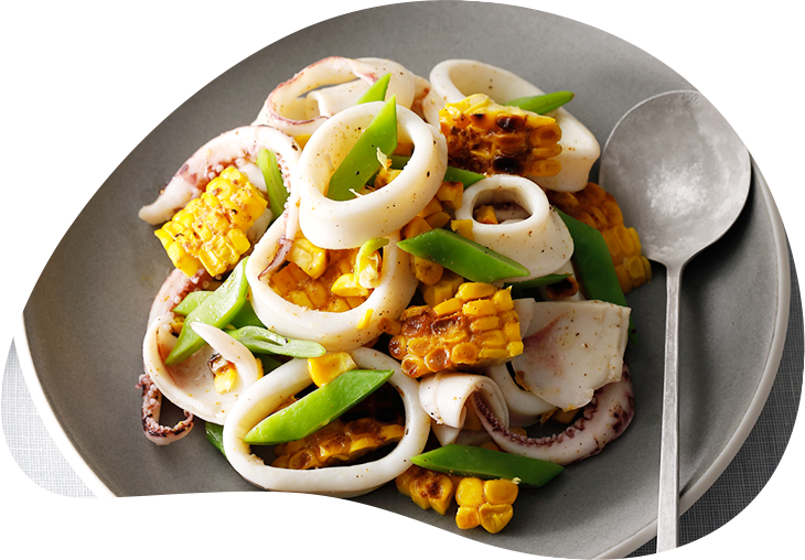 グリルで焼いて甘味と旨味が凝縮したトウモロコシと、さっと火を通してふっくら柔らかく仕上げたいかがベストマッチ。ゴマ油と酢のシンプルなドレッシングとカレーの風味があとを引く、食材が生きたおつまみです。