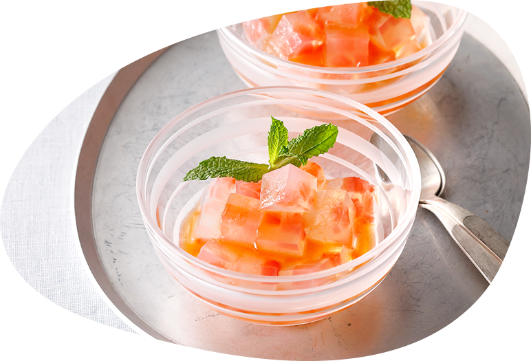 スイカの美味しさを存分に味わえる涼やかなおやつです。寒天には小さな角切りのスイカを入れて歯ざわりを残し、さらに、塩麹を加えたシロップでスイカとてんさい糖の甘さを引き立てました。添えたミントを一口かじると爽やかな風味を楽しめて、スイカの風味が際立ちます。