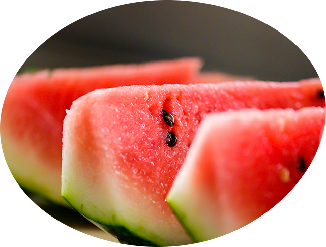 日本での栽培が盛んになったのは明治期以降。現在、栽培されている品種は、大玉スイカの「祭りばやし777」や小玉スイカの「紅こだま」、果肉が黄色いクリームスイカの「黄太郎」など様々で、特徴である縞模様がない黒皮スイカや種の少ない品種も生産されています。スイカは果肉の約90%が水分でできていて、カリウムが豊富な天然のスポーツドリンクとも呼ばれています。