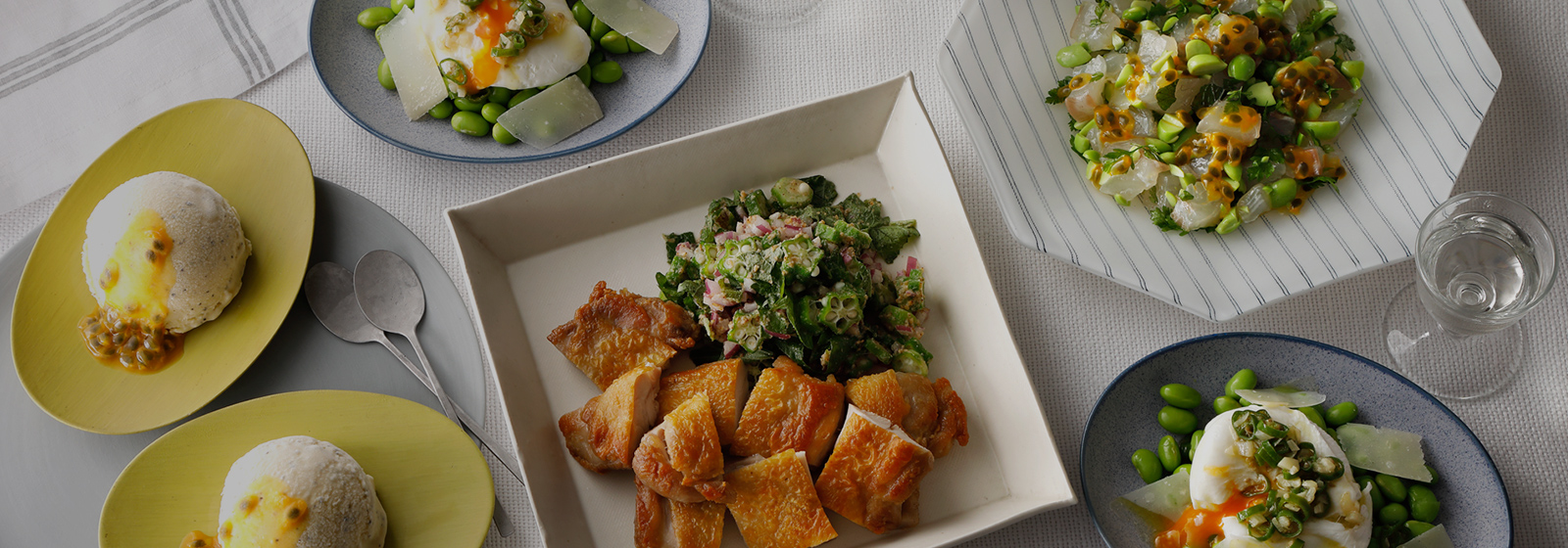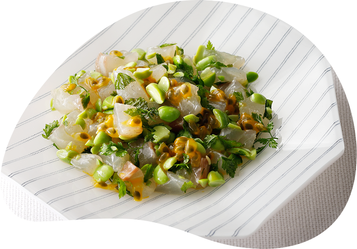 下ごしらえした材料を小さく切って和えた、シンプルながらも味わい深いおつまみです。鯛と枝豆の柔らかな甘味に、ハーブの香りとパッションフルーツの甘酸っぱさを加えた上品で爽やかな味わいが、絶妙な美味しさ。スパークリングワインや冷酒を合わせて、味わってみてください。