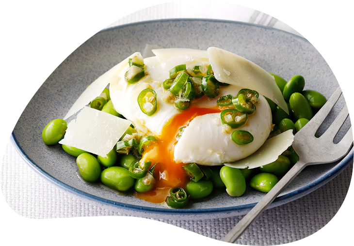 アーリオオーリオはニンニクとオリーブオイルのソースのこと。ニンニクの風味に旬の青唐辛子の清々しい辛さをプラスして、お酒のすすむソースに仕上げました。とろりとまろやかなポーチドエッグをソースと枝豆、チーズと絡めて召し上がれ。夏の定番おつまみになりそうな一皿です。