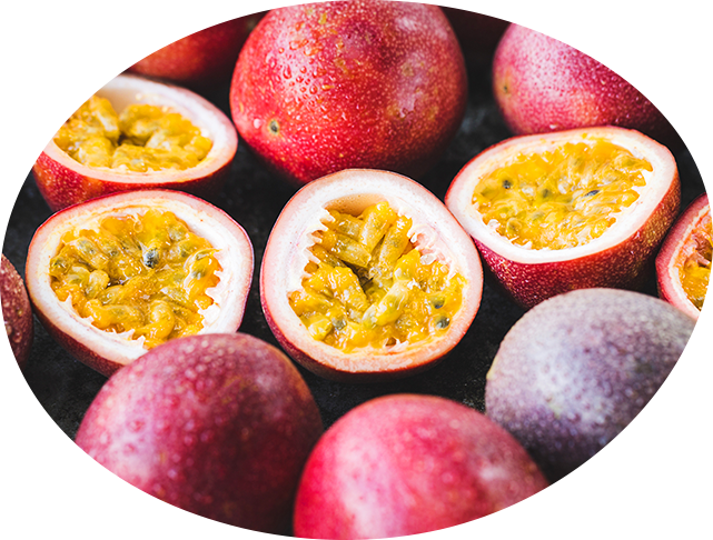 パッションフルーツは南米が原産地とされる熱帯・亜熱帯の果物です。果皮の色によって紫色種と黄色種に大きく分けられ、黄色種が世界の主流ですが、日本では紫色種が生産されています。中南米や東南アジアなどからの輸入品もありますが、国産品は鹿児島県奄美地方や沖縄県、東京都小笠原諸島といった亜熱帯地域が主な生産地で、5月から8月が出回り時期です。果実の中には大きめの黒い種を包む黄色いゼリー状の果肉と果汁が入っていて、芳醇な香りと甘酸っぱい味わい、種の歯ざわりが特徴です。店頭に並ぶものは完熟して甘く美味しいですが、追熟すると皮にシワができ、酸味が穏やかになって甘味をより感じられます。好みの風味を探すのも、パッションフルーツの楽しみ方のひとつです。