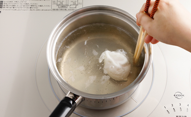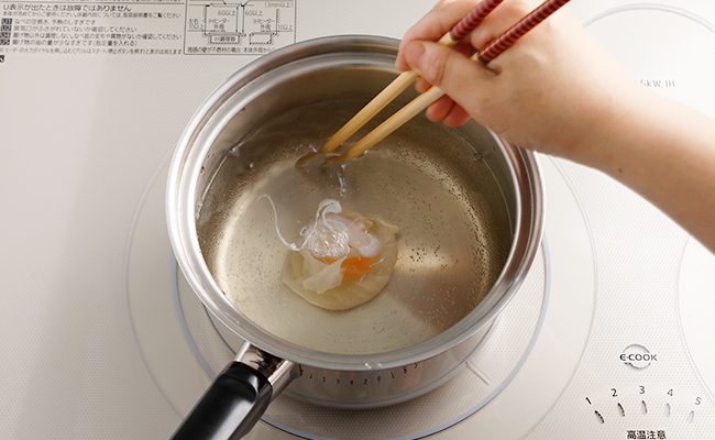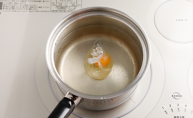 鍋(直径18cmを使用)に分量の水を入れて【火力8】で加熱し、ひと煮立ちしたら【火力3~4】にして酢を加える。菜箸で鍋の中心あたりを、円を描くようにぐるぐると混ぜ合わせて渦を作り、中央に卵1つをそっと落とし入れる。渦が弱くなったら再び菜箸で混ぜ合わせ、白身をまとめながら2~3分ゆで、ペーパータオルにとり出す。もう1つの卵も同様にする。